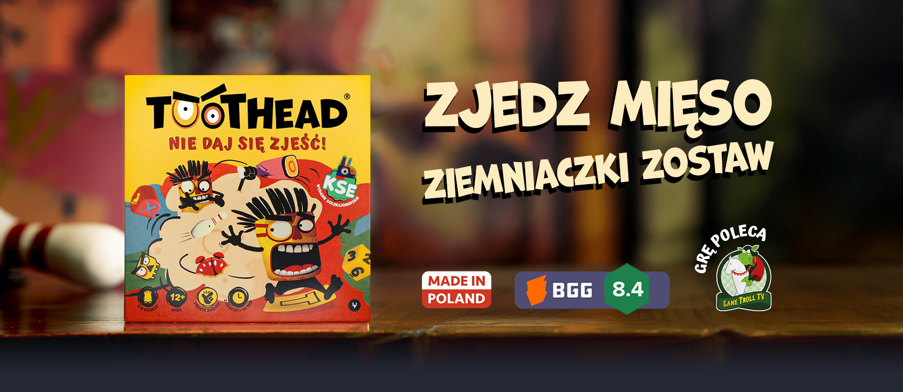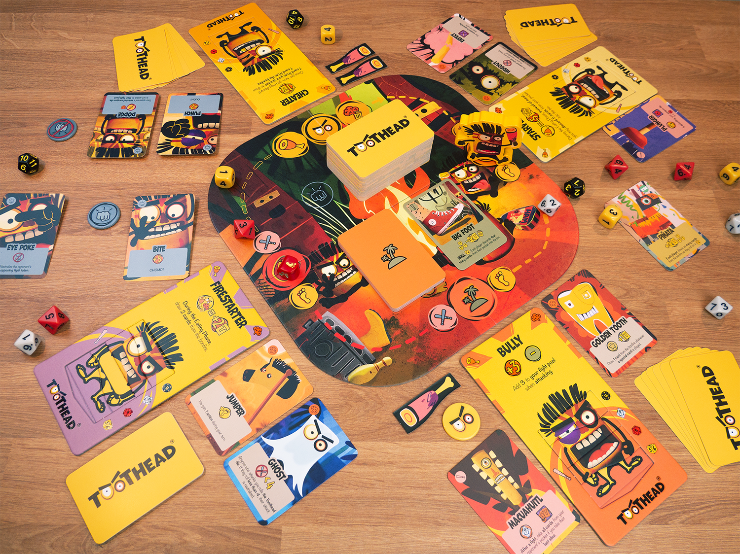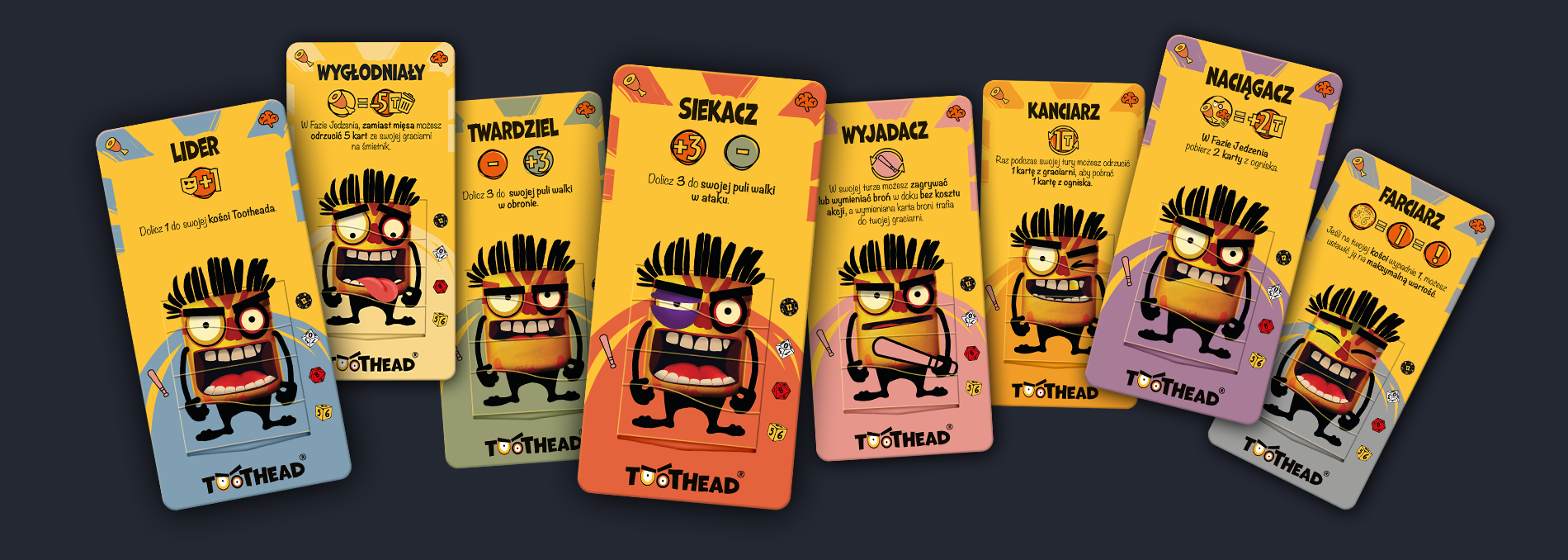 TOOTHEAD to prosta i zabawna gra karciano-kościano-planszowa z dużą dawką interakcji między graczami. Świetna na rodzinne spotkania i imprezy z przyjaciółmi. To również doskonała gra turniejowa.